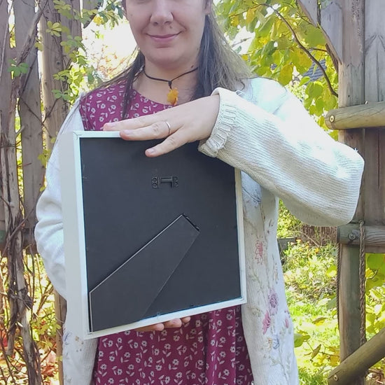 Obraz je dodáván se samolepícím háčkem pro pověšení bez vrtání. Můžete jej však i umístit na nábytek a opřít, díky zabudovanému stojánku.