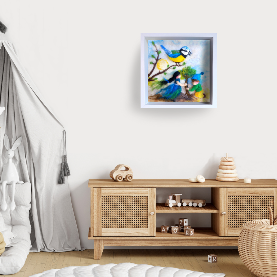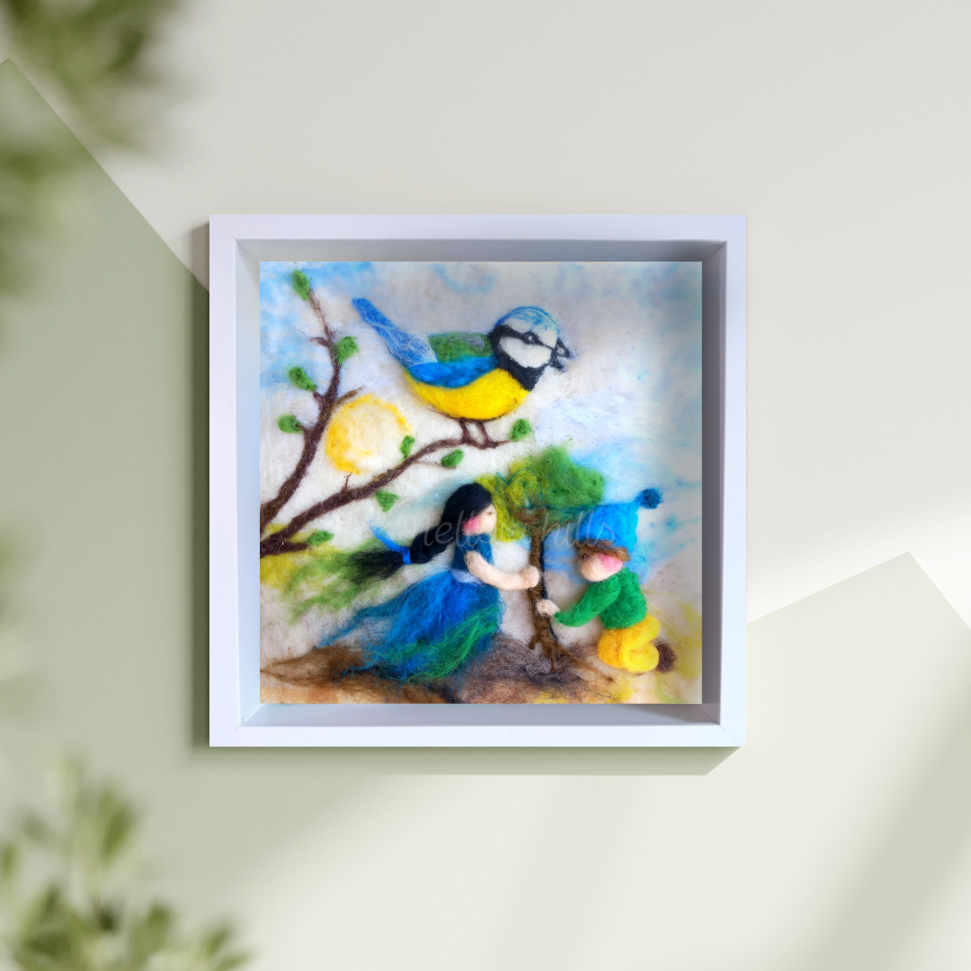 Jarní radosti, a sázení stromečku - to je reprodukce vlněného obrázku.