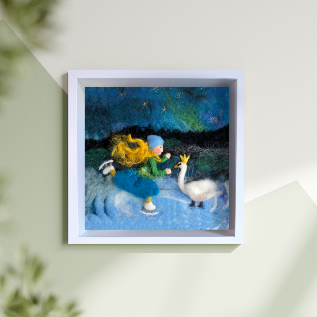 Nazula si brusle a vyjela po ledu, chladný vzduch ji ještě víc vybarvil červená líčka... A kdo se snáší z tmavé oblohy? Druhá královna se přiletěla ukázat a potěšit se zamrzlou vodní hladinou...