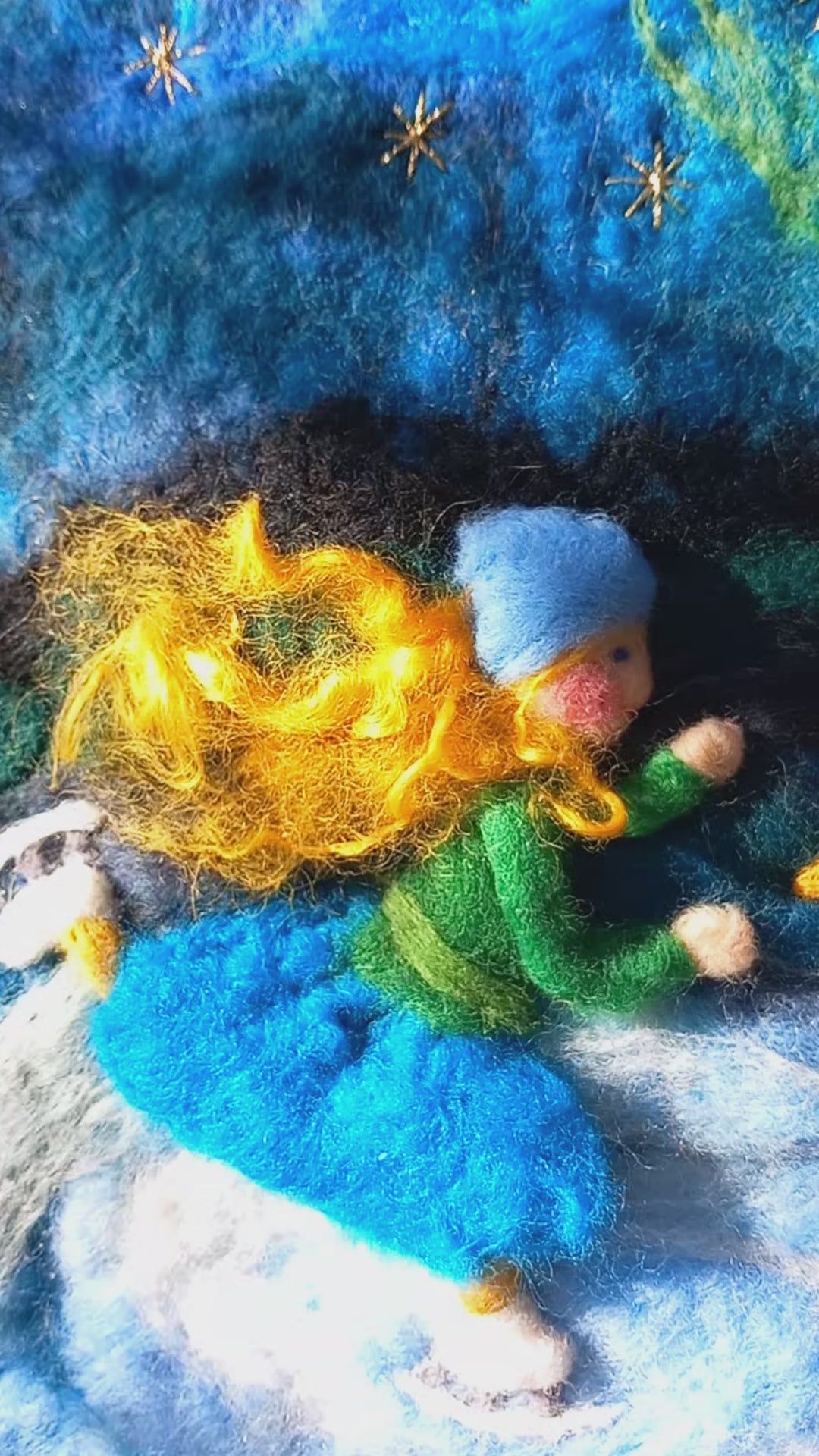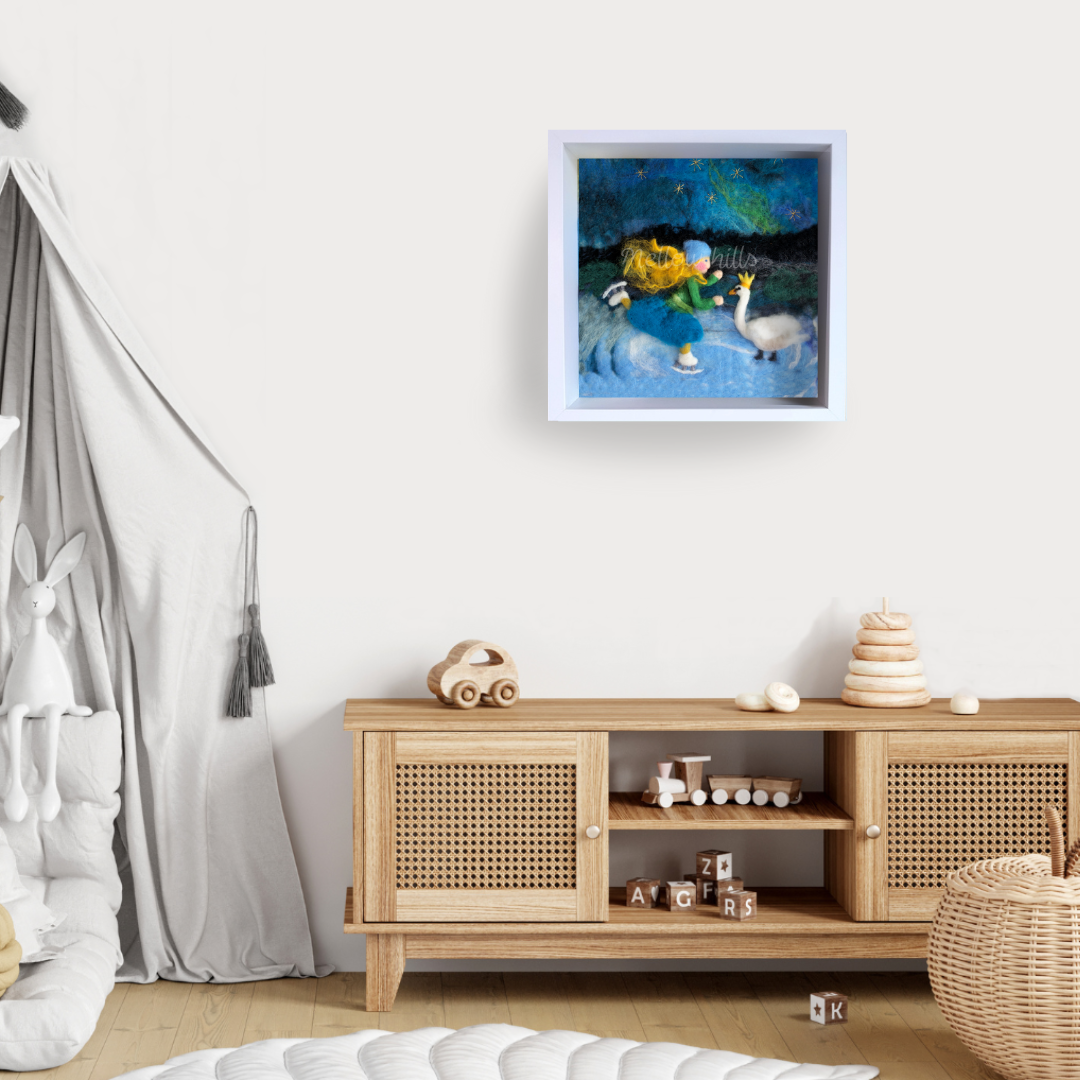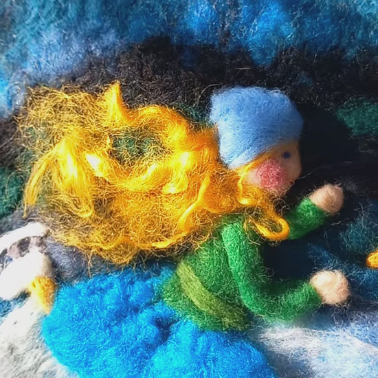 Vlněné malby Mellow hills jsou vytvořeny pomocí mokré i suché techniky plstění přírodní vlnou.